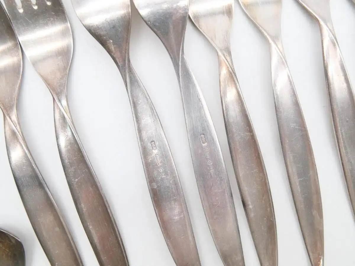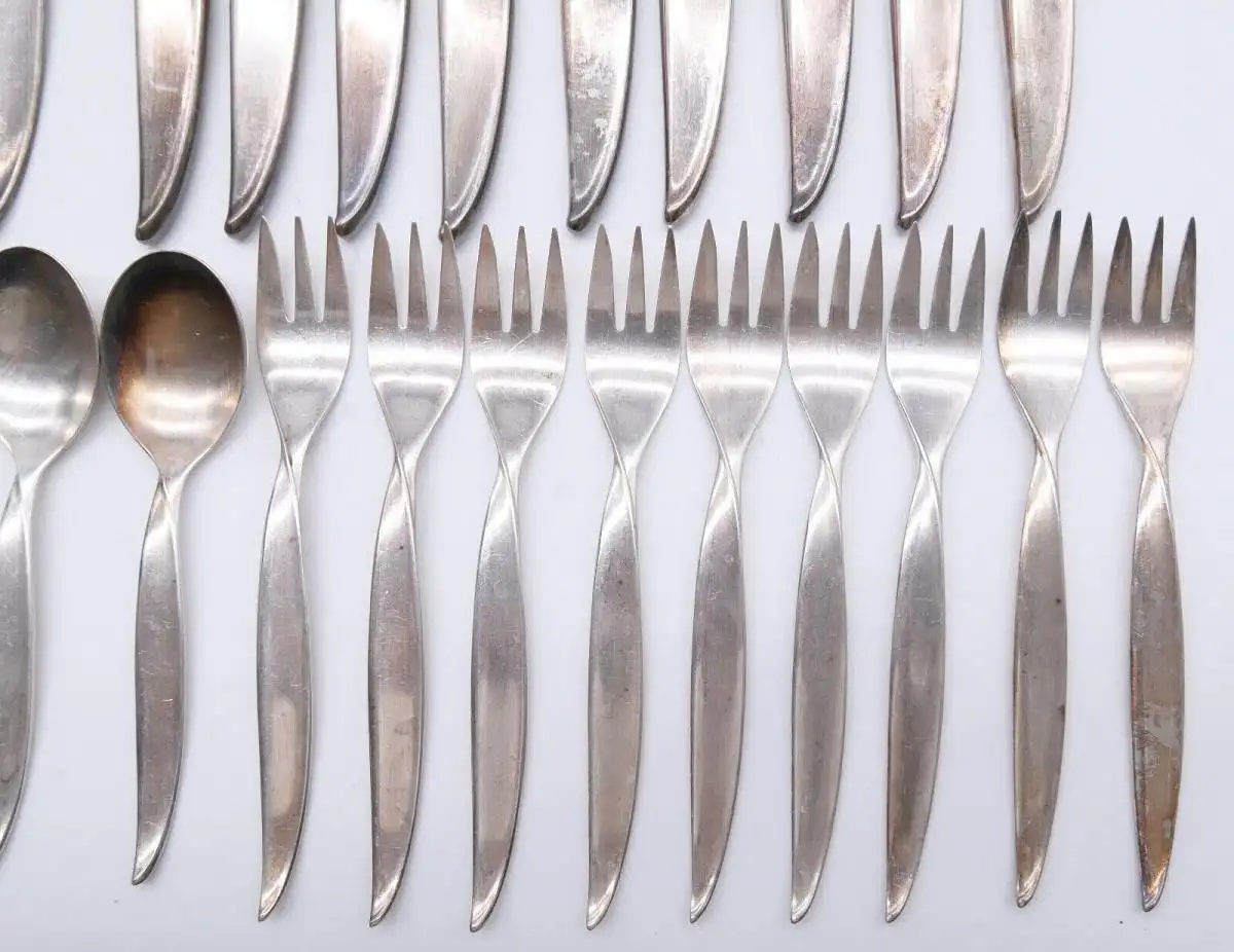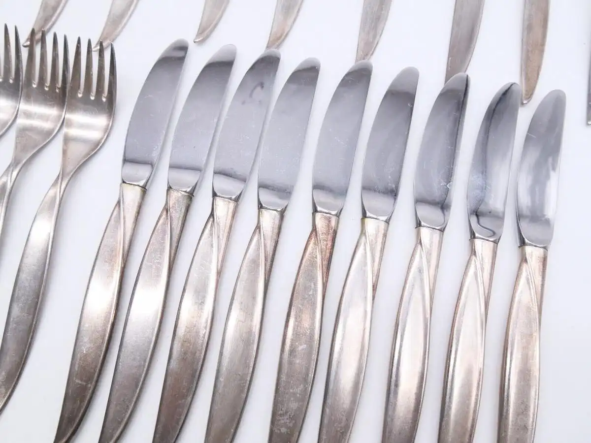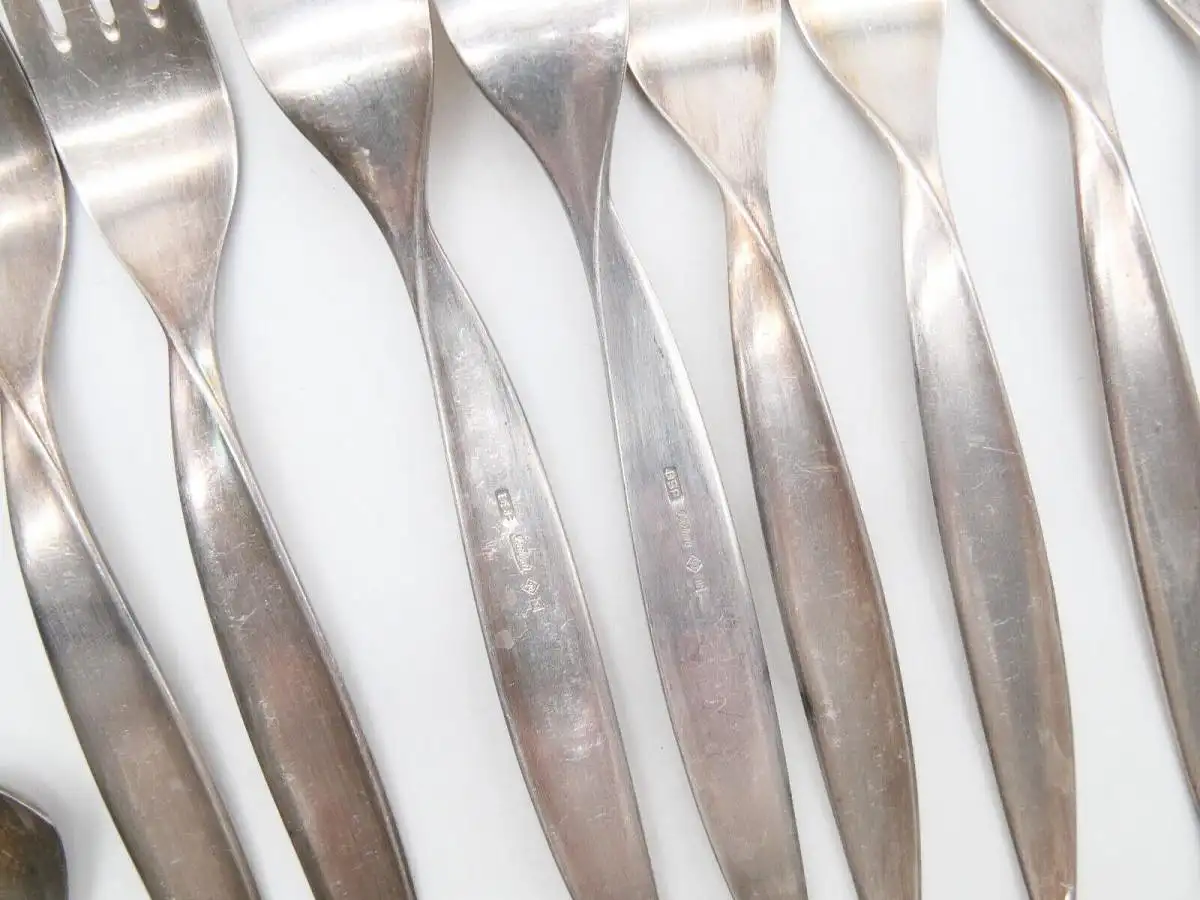 Die Besteckteile sind im gebrauchten Zustand mit Gebrauchsspuren, leichten Kratzern und Verschmutzungen, stark angelaufen, siehe Fotos. Das Besteck ist nicht gereinigt, geputzt oder geschönt worden. Bitte schauen Sie sich die Fotos zum Zustand des Artikels an, da diese Bestandteil der Beschreibung sind.