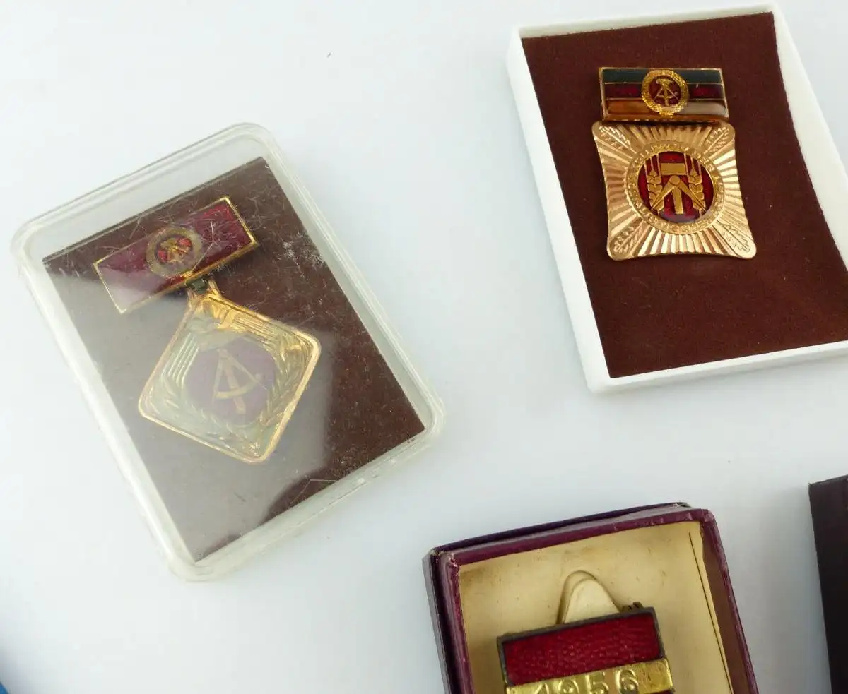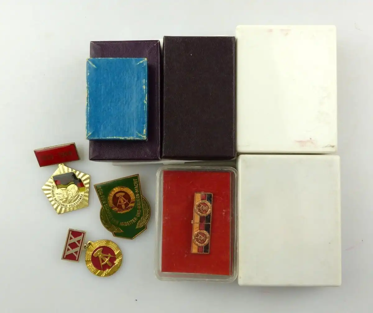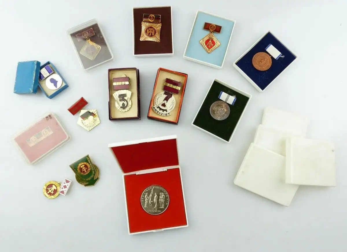 Sie sehen hier auf einen original alten 13 teiligen Posten verschiedener DDR Orden, Abzeichen, Nadeln.
