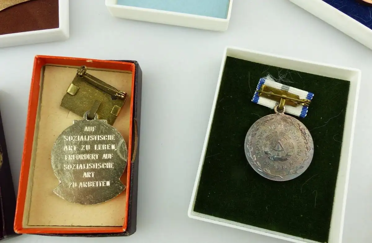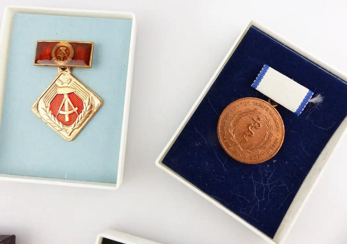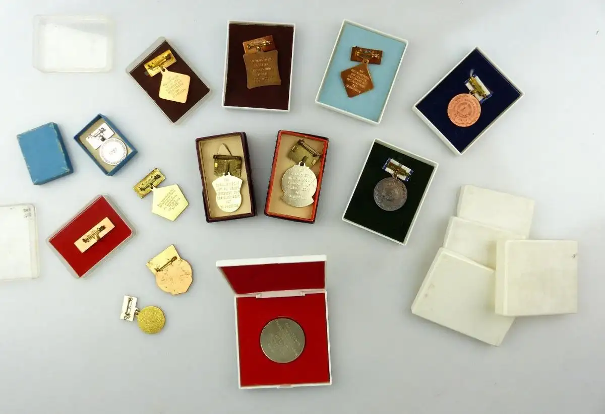 Sie sehen hier auf einen original alten 13 teiligen Posten verschiedener DDR Orden, Abzeichen, Nadeln.