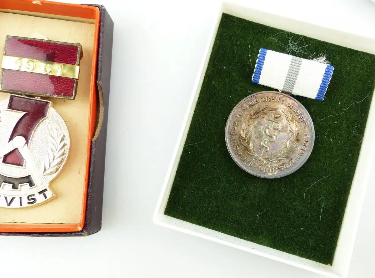 und bestoßenen Kanten, siehe Foto. Eine der Medaillen hat einen Abplatzer, siehe Foto.