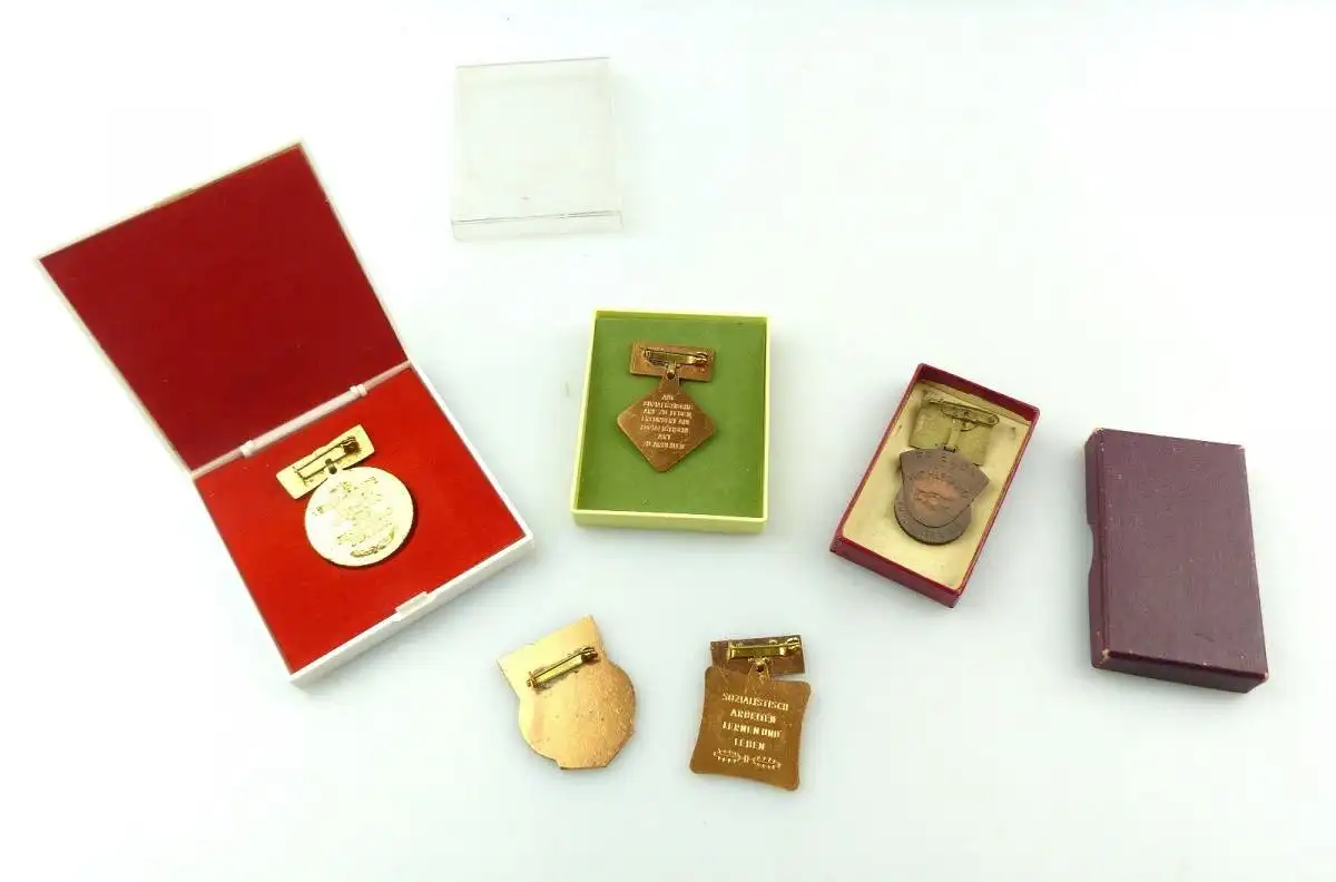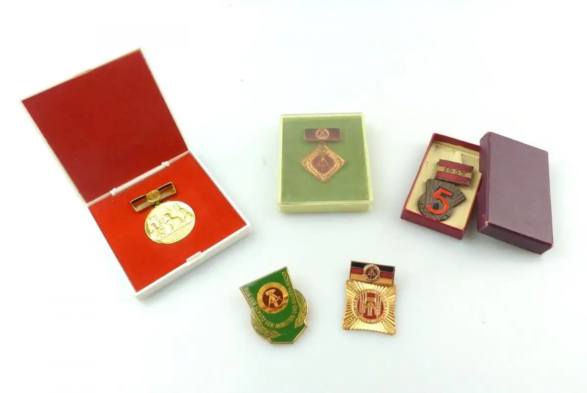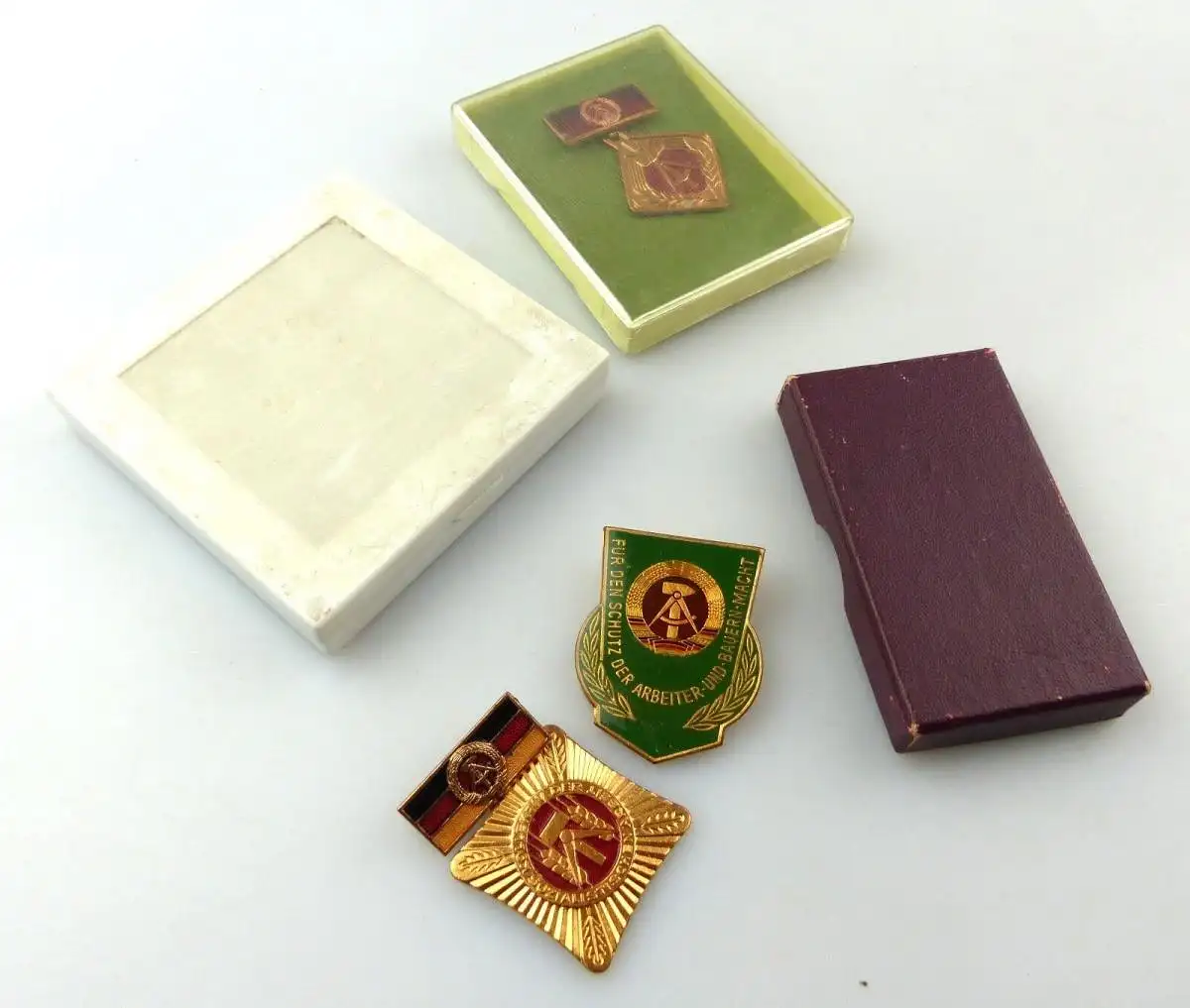 Sie sehen hier auf einen 5 teiligen Posten verschiedener DDR Abzeichen teilweise mit Etui wie abgebildet.