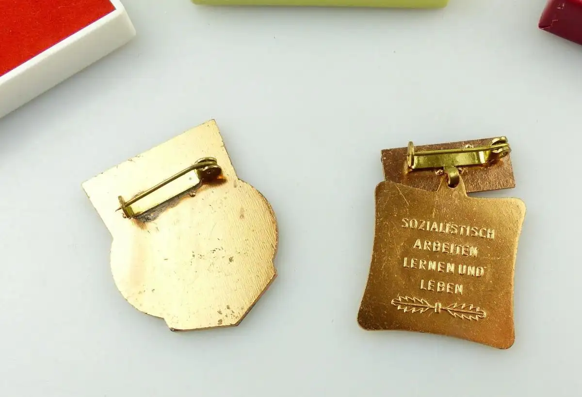 Die Abzeichen bzw. Anstecknadeln sind im gebrauchten Zustand mit Gebrauchsspuren wie kleinen Kratzern und Verschmutzungen, die Kanten sind etwas bestoßen.
