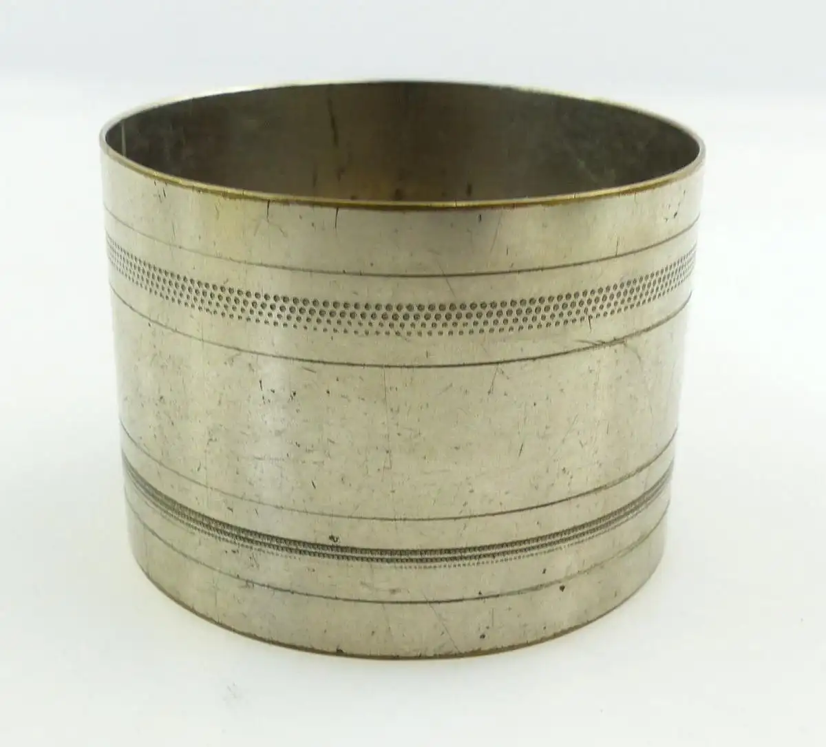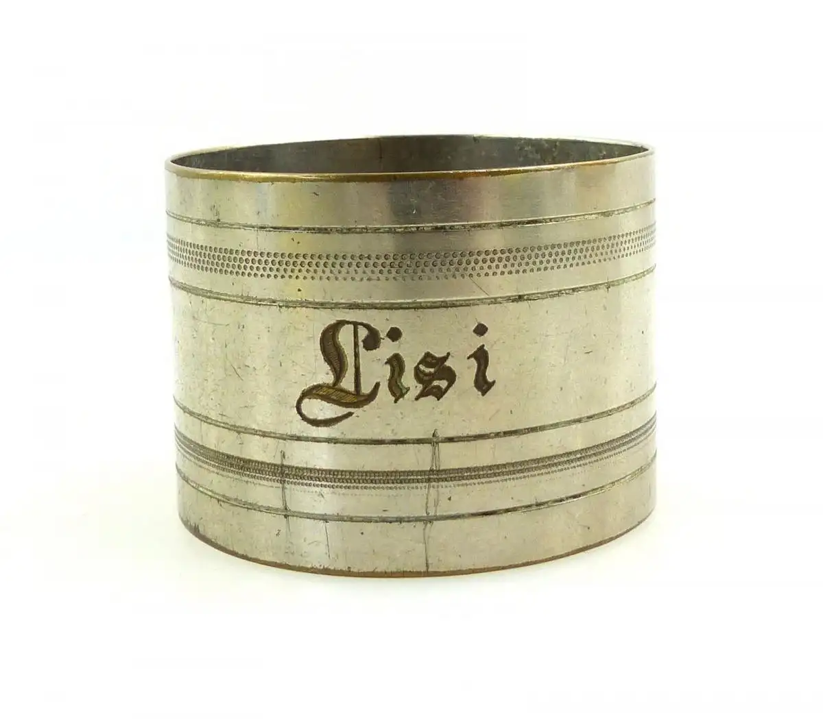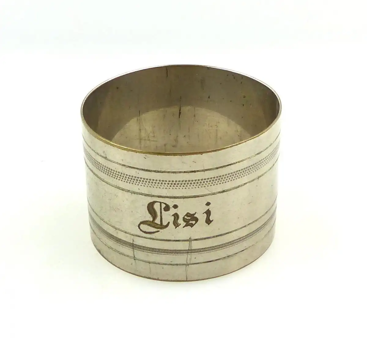 Herzlich Willkommen Gern können Sie auch in meine anderen Auktionen reinschauen. Viel Spaß dabei Dekorativer Serviettenring (wohl versilbert) mit Aufschrift Lisi. \nGewicht ca.: 32 g Durchmesser ca.: 50 mm Höhe ca.: 36 mm Metall wohl versilbert Der Serviettenring ist im gebrauchten Zustand mit Gebrauchsspuren, Kratzern und Verschmutzungen, siehe Fotos. Der Serviettenring ist etwas verbeult. Der Artikel ist nicht gereinigt, geputzt oder geschönt worden. Bitte sehen Sie sich die Fotos zum Zustand des Artikels an, da diese Bestandteil der Beschreibung sind.