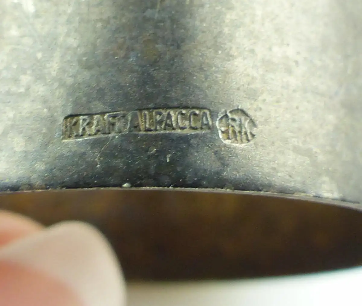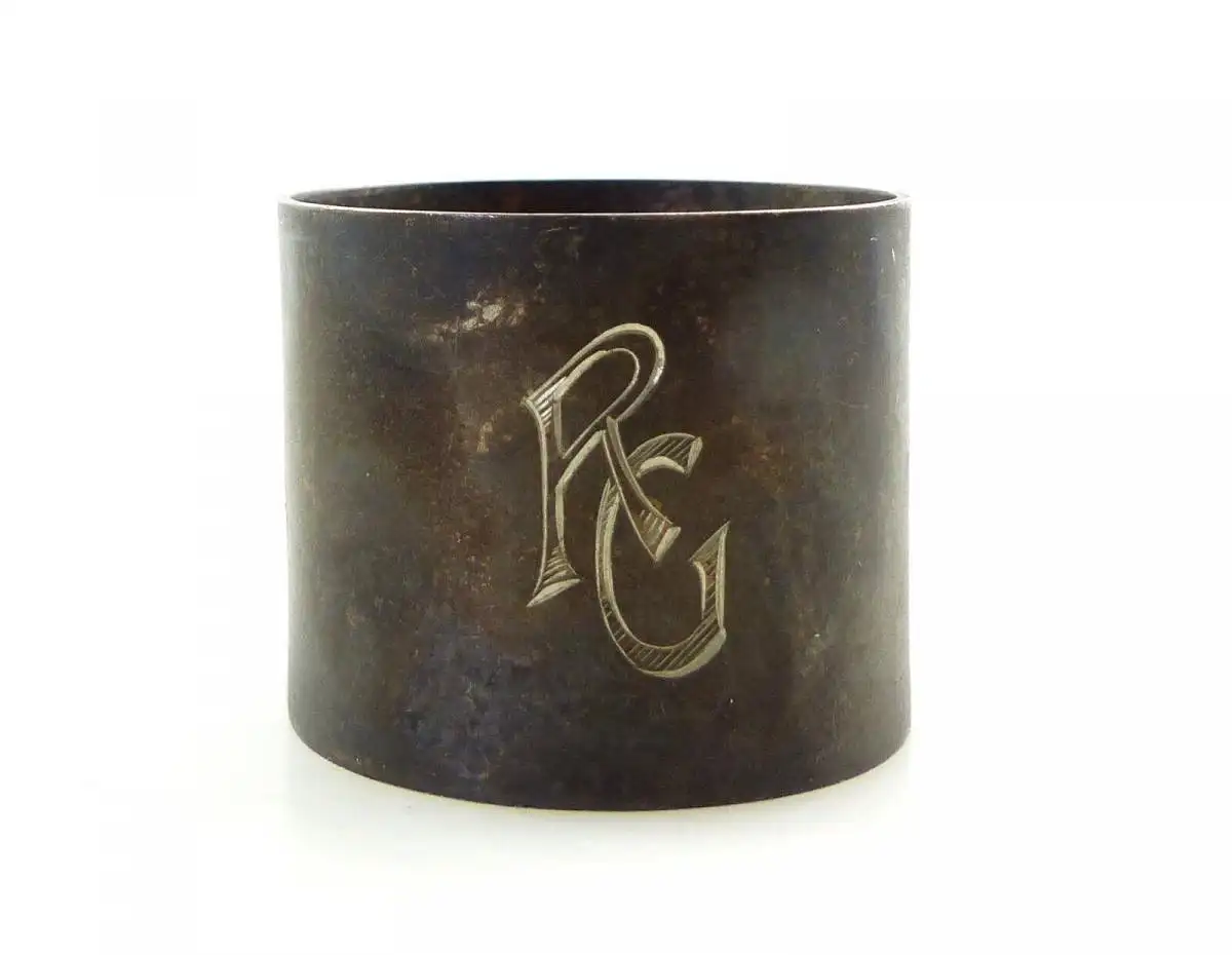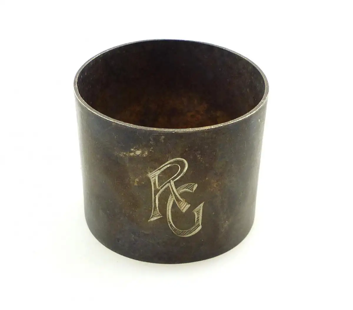 Herzlich Willkommen Gern können Sie auch in meine anderen Auktionen reinschauen. Viel Spaß dabei Alter Serviettenring mit Monogramm "RG" \nGewicht ca.: 23 g Durchmesser ca.: 37 mm Höhe ca.: 30 mm Kraft Alpacca Der Serviettenring ist im gebrauchten Zustand mit Gebrauchsspuren, kleinen Kratzern und Verschmutzungen, siehe Fotos. Der Artikel ist nicht gereinigt, geputzt oder geschönt worden. Bitte sehen Sie sich die Fotos zum Zustand des Artikels an, da diese Bestandteil der Beschreibung sind.