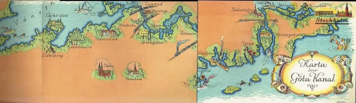 sehr guter Zustand, geringe Gebrauchs- und Alterungsspuren: Umschlag mit kleinen Blessuren an Ecken und Kanten - Widmung von 1935 im Vorsatz - Seiten sauber und ordentlich, Only a couple of hundred years ago Sweden was, to the great majority of strangers, an unknown land near the Pole, and in their imagination they pictured a world of snow where the people walked about clothed in skins, and wolfs and bears were the lords of the forest. A few travellers who had found their way to this distant winter land returned with stories of a queer race of people in the farthermost north who followed their herds of half-wild animals in a roadless wilderness. The land round the Arctic Circle is now incorporated in the world's great commercial intercourse — its natural riches, the woods of the forests and the ore of the mountains are converted to use by modern industries working with American speed, and Sweden has a well known sound all over the world. There are convenient steamer communications between the Continent and the Swedish ports, and the tourist who now strolls in Hyde Park in London, Unter den Linden in Berlin or along the canals in old Amsterdam can, after a short journey by air or water, step on to Swedish soil. Shining railway lines radiate all over Sweden, highroads, canals and lakes open the way to far off hidden districts. The whole big country — the sagaland of Europe — is accessible to everybody. But the wilderness and adventure have not altogether given place to modern times. The Northern forests still remain — mile after mile, right down to the southernmost province of the country. Under the drooping fir trees highwaymen and outlaws no longer hide, but the forest lakes stare like great black eyes and the giant elk still walks in the undergrowth in the eternal dusk of the forests. In old Europe ... - Sweden as a tourist land - History of the Göta Canal - A journey by Göta Canal steamer from Gothenburg to Stockholm - Jönköping-Stockholm "Edvin Ollers, ursprungligen Olsson, född 28 mars 1888 i Norrtälje, död 2 december 1959 i Hedvig Eleonora församling, Stockholm, var en svensk konstnär och formgivare." (Wikipedia), kartoniert, ca. 20,5 x 13,5, 46 Seiten mit zahlreichen farbigen Illustrationen, s/w-Fotos und 1 Karte (Leporello von 5 Seiten)
