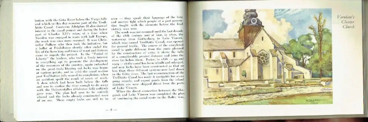 sehr guter Zustand, geringe Gebrauchs- und Alterungsspuren: Umschlag mit kleinen Blessuren an Ecken und Kanten - Widmung von 1935 im Vorsatz - Seiten sauber und ordentlich, Only a couple of hundred years ago Sweden was, to the great majority of strangers, an unknown land near the Pole, and in their imagination they pictured a world of snow where the people walked about clothed in skins, and wolfs and bears were the lords of the forest. A few travellers who had found their way to this distant winter land returned with stories of a queer race of people in the farthermost north who followed their herds of half-wild animals in a roadless wilderness. The land round the Arctic Circle is now incorporated in the world's great commercial intercourse — its natural riches, the woods of the forests and the ore of the mountains are converted to use by modern industries working with American speed, and Sweden has a well known sound all over the world. There are convenient steamer communications between the Continent and the Swedish ports, and the tourist who now strolls in Hyde Park in London, Unter den Linden in Berlin or along the canals in old Amsterdam can, after a short journey by air or water, step on to Swedish soil. Shining railway lines radiate all over Sweden, highroads, canals and lakes open the way to far off hidden districts. The whole big country — the sagaland of Europe — is accessible to everybody. But the wilderness and adventure have not altogether given place to modern times. The Northern forests still remain — mile after mile, right down to the southernmost province of the country. Under the drooping fir trees highwaymen and outlaws no longer hide, but the forest lakes stare like great black eyes and the giant elk still walks in the undergrowth in the eternal dusk of the forests. In old Europe ... - Sweden as a tourist land - History of the Göta Canal - A journey by Göta Canal steamer from Gothenburg to Stockholm - Jönköping-Stockholm "Edvin Ollers, ursprungligen Olsson, född 28 mars 1888 i Norrtälje, död 2 december 1959 i Hedvig Eleonora församling, Stockholm, var en svensk konstnär och formgivare." (Wikipedia), kartoniert, ca. 20,5 x 13,5, 46 Seiten mit zahlreichen farbigen Illustrationen, s/w-Fotos und 1 Karte (Leporello von 5 Seiten)