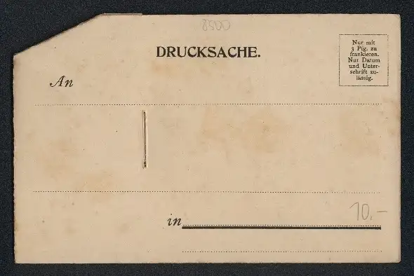 Personenbezogene Daten auf der Rückseite der Karte wurden durch blauen Textmarker unkenntlich gemacht. Die blauen Stellen sind auf die Vorderseite durchgeweicht und wirken sich negativ auf das Postkartenfoto aus