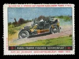 Zum 30 jährigen Geschäftsjubiläum 1883 - 1913 80.000 km durch Amerika auf Fischers Kugellagern Marke F'AG, Kugel - Fabrik Fischer, Schweinfurt, Serie 2, Nr. 2, Größe/Zustand: 5x7 , guter Zustand, Original alte Reklamemarke die seinerzeit für die Werbung benutzt wurde