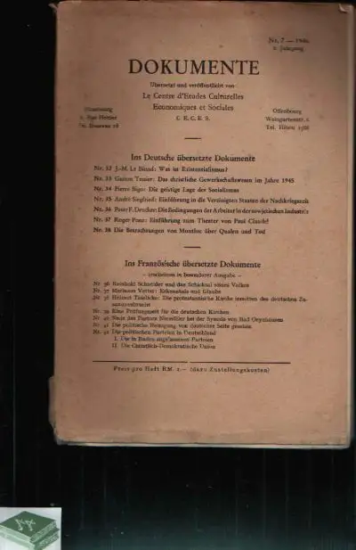 Dokumente - Nr. 32 bis 38; Le Centre d´Etudes Culturelles Economiques et Social; Geschichte; Existentialismus; Gewerkschaftswesen im Jahre 1945; geistige Lage des Sozialismus; Arbeiter in der sowjetischen Industrie