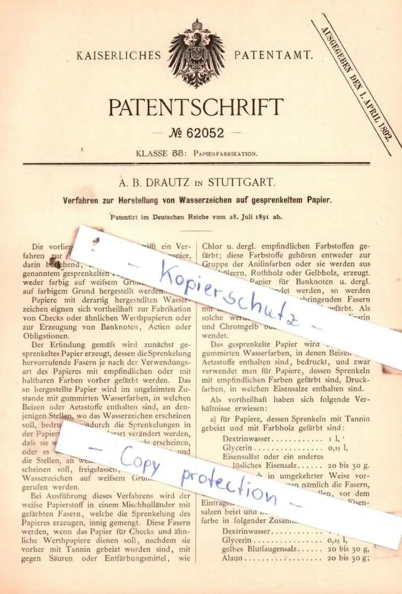 original Patent - A. B. Drautz in Stuttgart , 1891 , Papierfabrikation !!!
