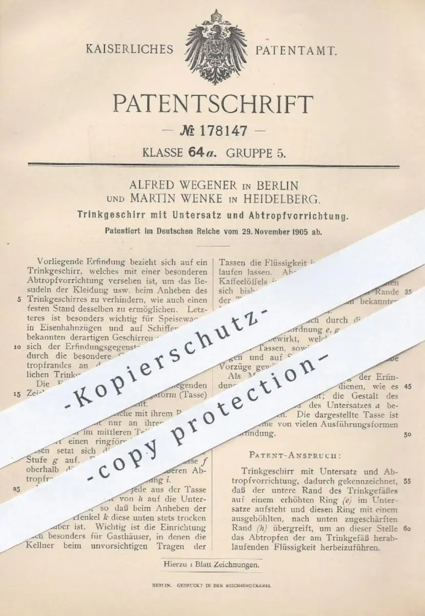 original Patent - Alfred Wegener , Berlin | M. Wenke , Heidelberg 1905 , Trinkgeschirr mit Untersatz | Tasse , Geschirr