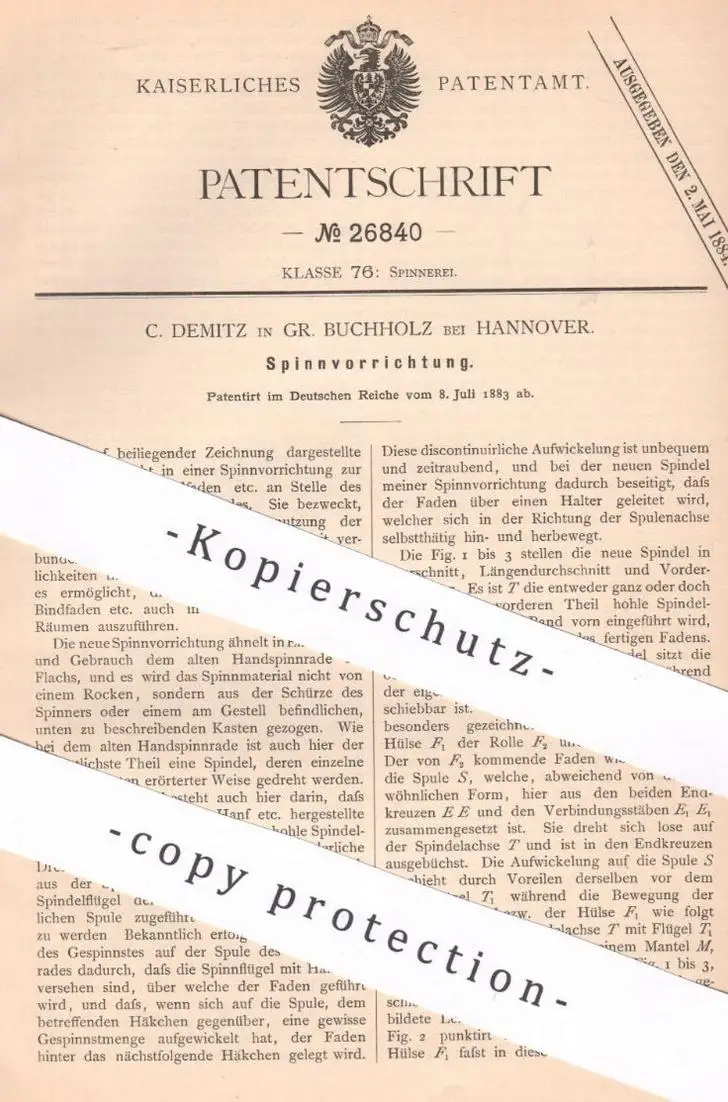 original Patent - C. Demitz , Gr. Buchholz / Hannover , 1883 , Spinnvorrichtung | Spinnmaschinen | Weben