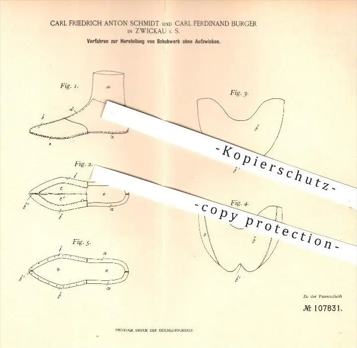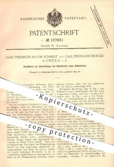 original Patent - C. F. A. Schmidt , C. F. Burger , Zwickau , 1899 , Herstellung von Schuhwerk , Schuster , Schuhe !!!