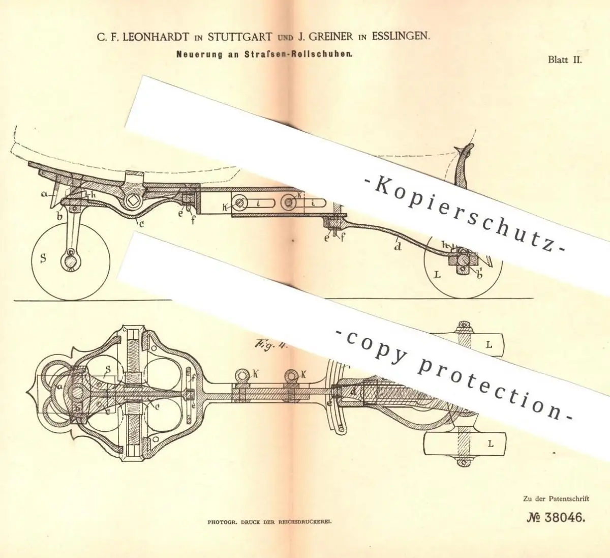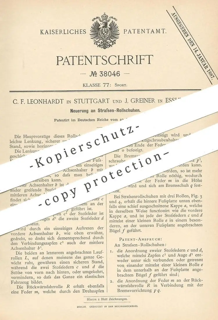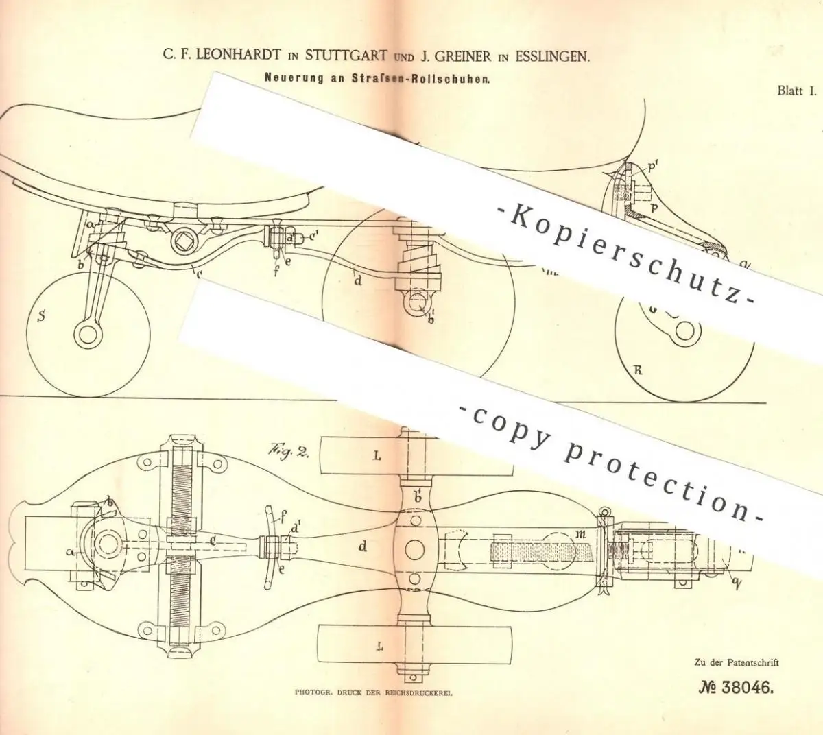 original Patent - C. F. Leonhardt , Stuttgart , J. Greiner , Esslingen , 1886 , Straßen - Rollschuhe | Rollschuh | Sport