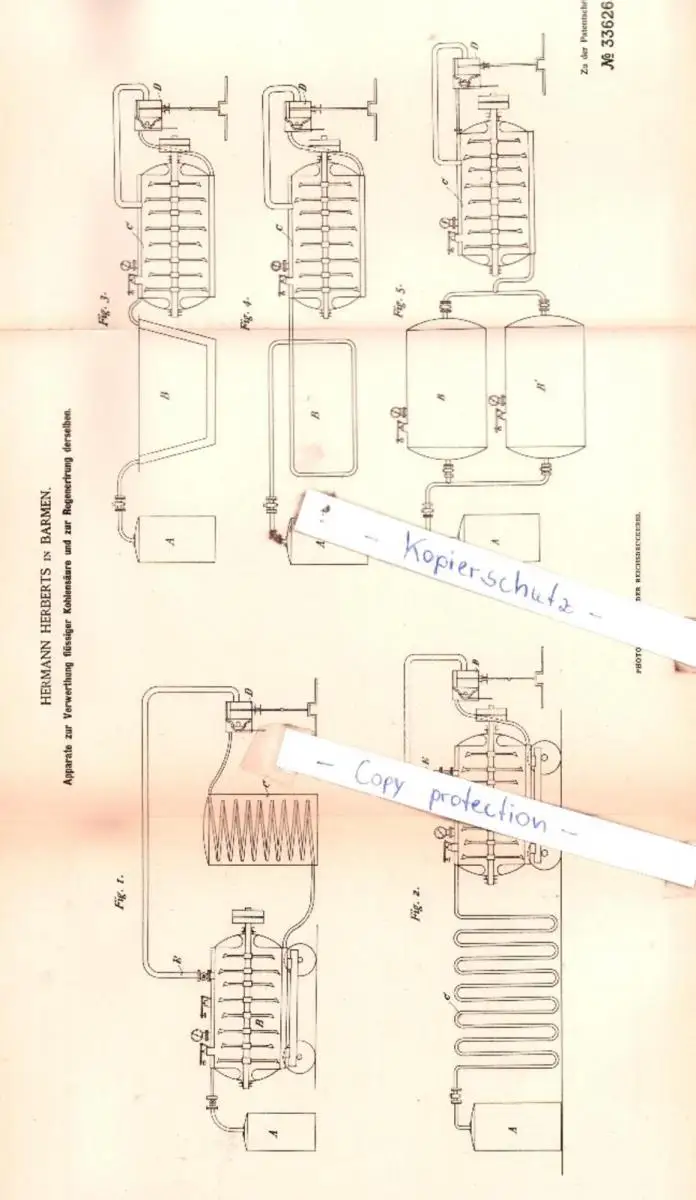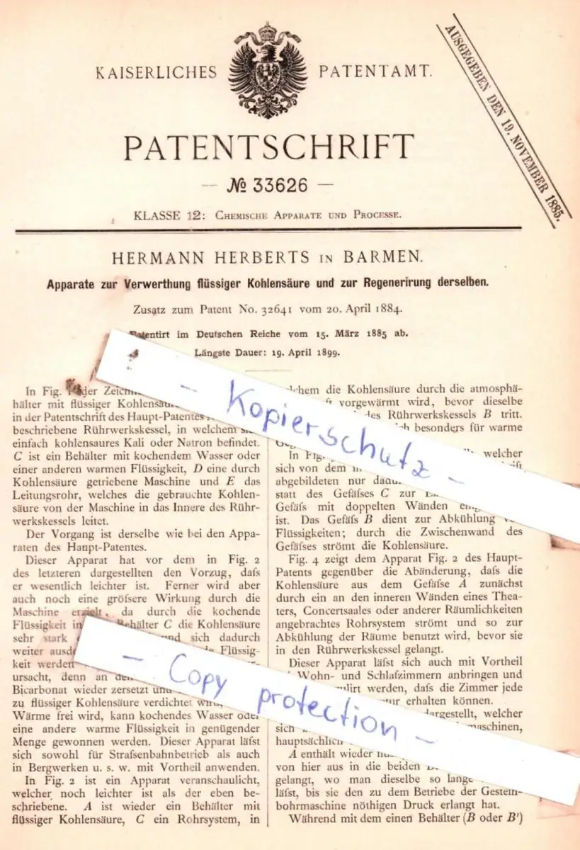 original Patent - Hermann Herberts in Barmen , 1885 , Apparate zur Verwerthung flüssiger Kohlensäure !!!