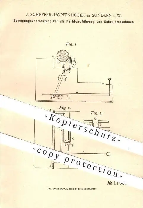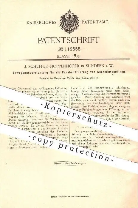 original Patent - J. Scheffer - Hoppenhöfer , Sundern , 1900 , Farbbandführung an Schreibmaschinen , Schreibmaschine !!!