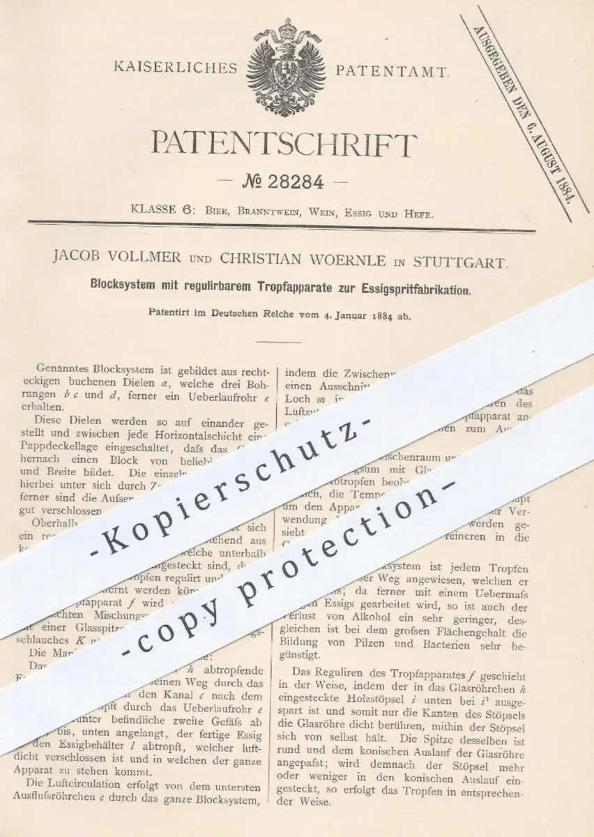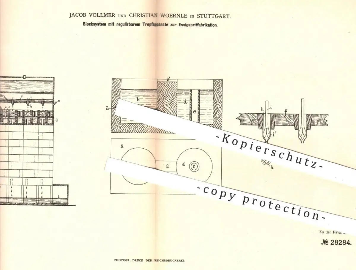 original Patent - Jacob Vollmer , Ch. Woernle , Stuttgart , 1884 , Blocksystem zur Essigspritfabrikation | Essig , Sprit