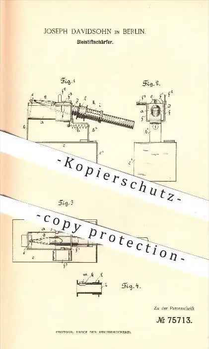 original Patent - Joseph Davidsohn , Berlin , 1893 , Bleistift - Schärfer , Anspitzer , Stift , Stifte , Schreibmaterial