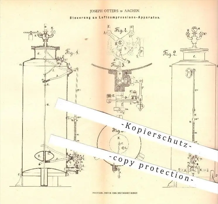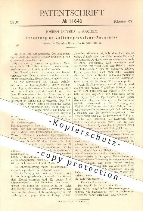 original Patent - Joseph Otters in Aachen , 1880 , Steuerung an Luftkompressions - Apparaten , Kompressor , Gebläse !!