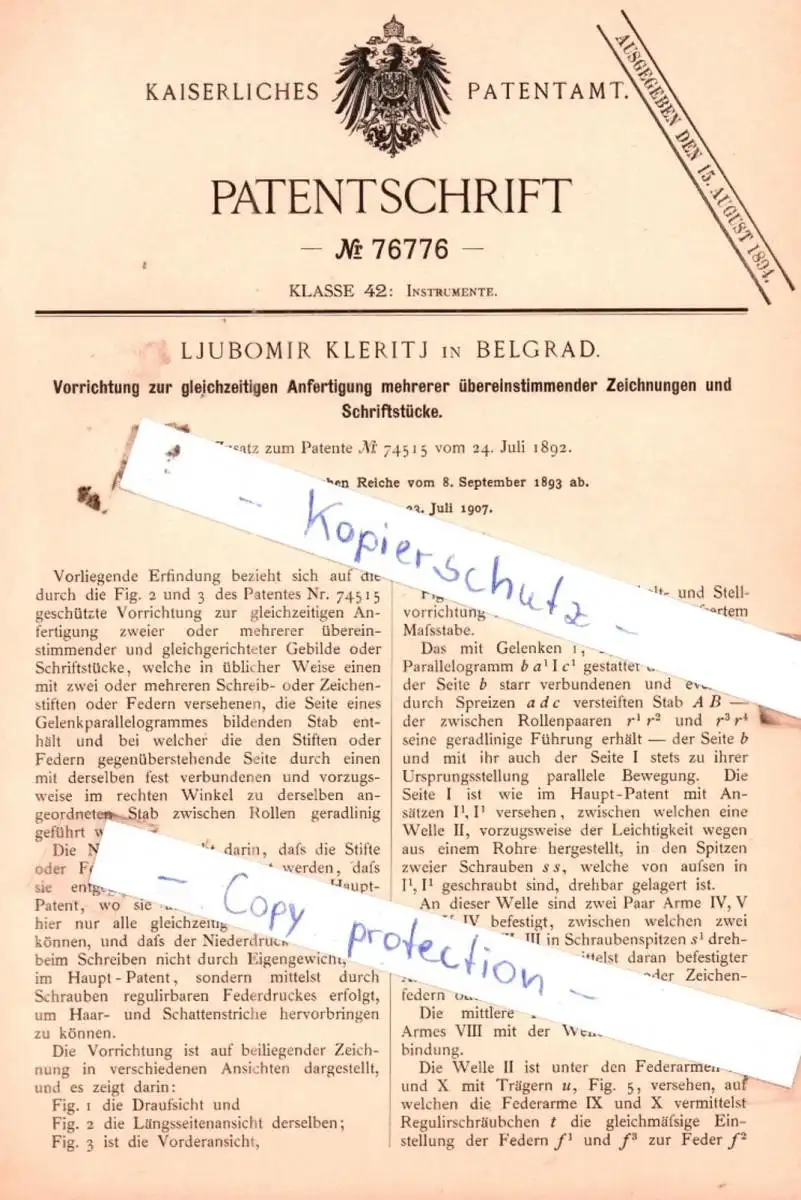 original Patent - Ljubomir Kleritj in Belgrad , 1893 , Instrumente !!!