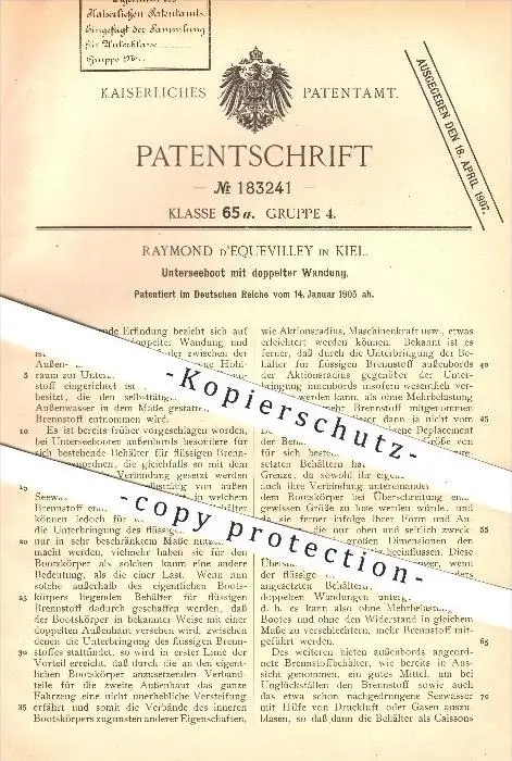 original Patent - Raymond d'Equevilley in Kiel , 1905 , Unterseeboot , U-Boot , U-Boote , Schiff , Schiffbau , Boot !!!
