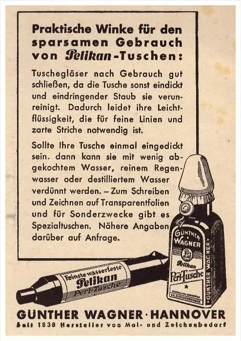 original Werbung - 1941 - PELIKAN Tusche , Perl-Tusche , Günther Wagner in Hannover !!!
