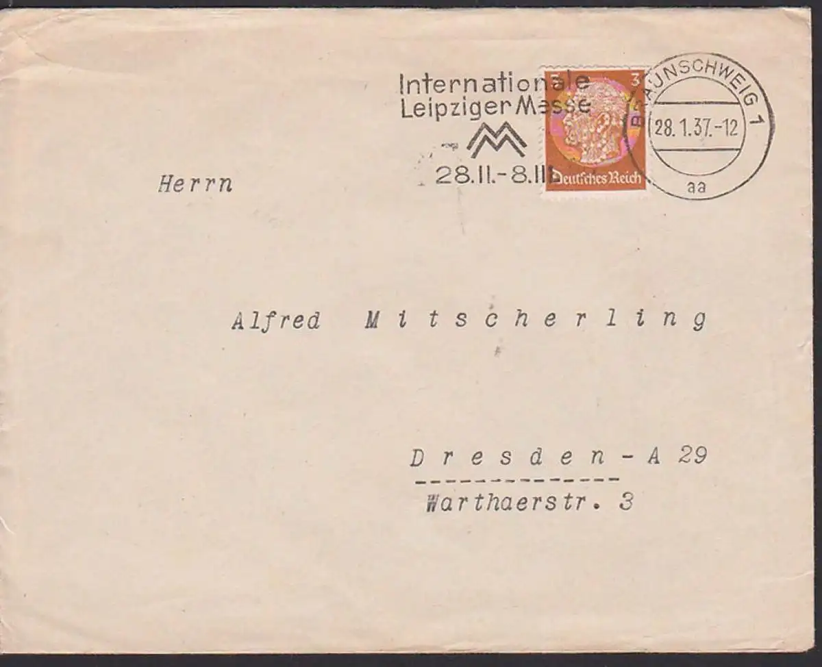perfin "PEB" Braunschweig MWSt. Internationale Leipziger Messe 28.1.37