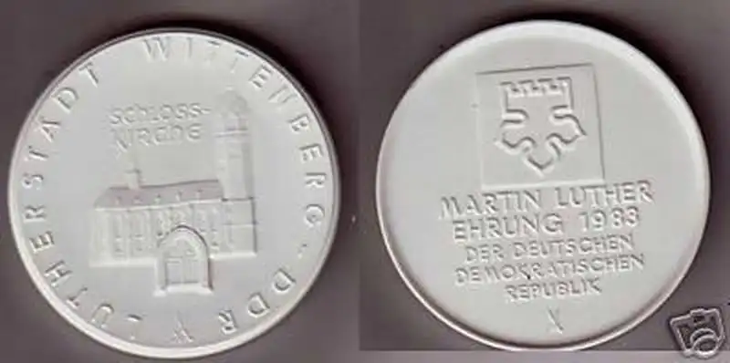 schöne Medaille aus weissem Meissner Porzellan, Vorderseite: Lutherstadt Wittenberg Schlosskirche, Rückseite: Martin Luther Ehrung 1983 der DDR, gekreuzte Meissner Schwerter, Durchmesser: 63 mm, Gewicht: 37,3 Gramm, sehr gute Erhaltung siehe Bild,