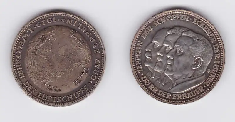 Vorderseite: Zeppelin der Schöpfer, Eckener der Führer, Dürr der Erbauer, Rückseite: Graf Zeppelin I. Weltfahrt des Luftschiffs 1929, Preuss. Staatsmünze 900er Silber fein, Durchmesser 36 mm, Gewicht 24,8 Gramm, vorzügliche Erhaltung siehe Bild,
