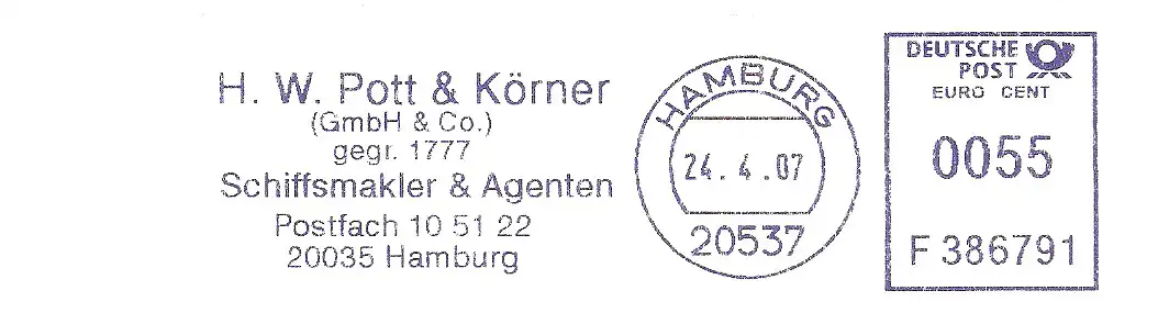 Freistempel F386791 Hamburg - Schiffsmakler & Agenten H.W. Pott & Körner (#2187)