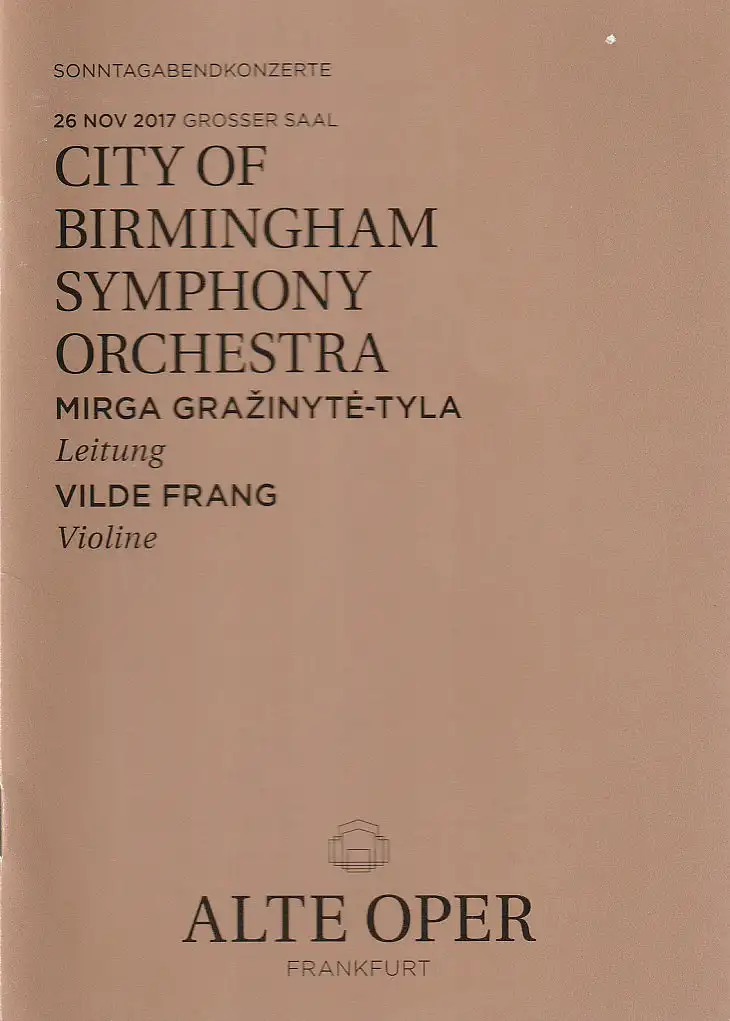 City of Birmingham Symphony Orchestra. Leitung: Mirga Grazinyte-Tyla. Vilde Frang, Violine. Programm: WOLFGANG AMADEUS MOZART: Ouvertüre zur Oper Die Zauberflöte. EDWARD ELGAR: Konzert für Violine und Orchester h-Moll, op. 61. LUDWIG VAN BEETHOVEN: Sinfonie Nr. 6 F-Dur op. 68 ( pastorale ). - Theaterprogramm, Opernprogramm, Ballettprogramm, Musicalprogramm, Konzertprogramm, Theatermemorabilia, Programmhefte Sammlung, deutsche Theatergeschichte.