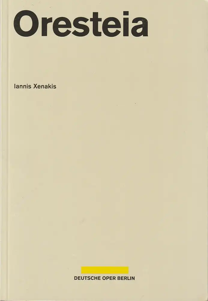 Musiktheater für Bariton, Chor, Kinderchor und Kammerorchester. Nach der Tragödie des Aischylos. Musikalische Leitung: Moritz Gnann. Inszenierung: David Hermann. Bühne und Kostüme: Christof Hetzer. Mitwirkende: Michael Hofmeister, Seth Caricio, Andrew Harris, Georg Glasl, Björn Matthiessen, Aristoteles Chaltidis, Spyridon Markopoulos, Eleftherios Veniadis, u. a, Orchester, Chor, Extrachor und Kinderchor der Deutschen OperBerlin. - Theaterprogramm, Opernprogramm, Ballettprogramm, Musicalprogramm, Konzertprogramm, Theatermemorabilia, Programmhefte Sammlung, deutsche Theatergeschichte.