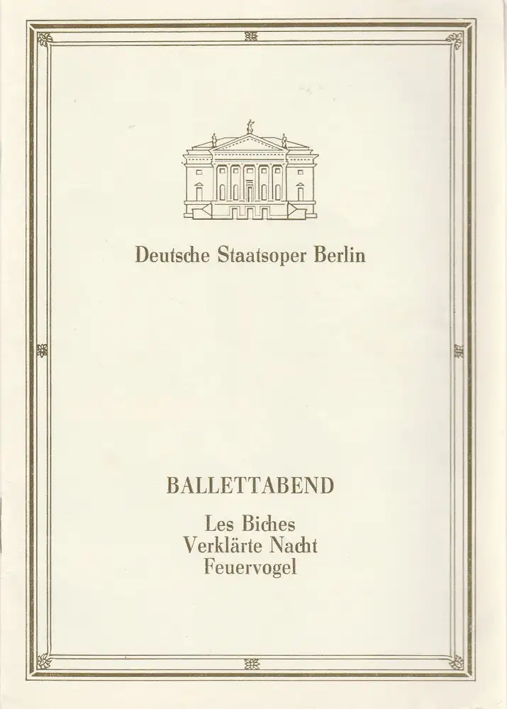Ballettabend mit Choreographien von CONRAD DRZEWIECKI. Musikalische Leitung: Siegfried Kurz. Bühne und Kostüme: Ktzysztof Pankiewicz. LES BICHES: Musik von Francis Poulenc. Mitwirkende: Ines Dalchau, Tatjana Marinowa, Korina Franke, u. a. VERKLÄRTE NACHT: Musik von Arnold Schönberg. Mitwirkende: Steffi Scherzer, Ralf Stengel, Andreas kelle, u. a. DER FEUERVOGEL: Musik von Igor Strawinsky. Mitwirkende: Monika Lubitz, Jörg Lucas, Torsten Händler, u. a. - Theaterprogramm, Opernprogramm, Ballettprogramm, Musicalprogramm, Konzertprogramm, Theatermemorabilia, Programmhefte Sammlung, deutsche Theatergeschichte.