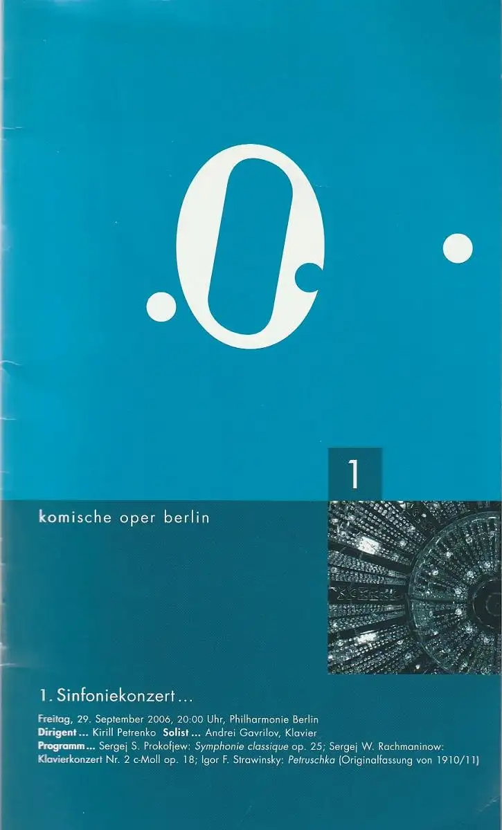 Dirigent: Kirill Petrenko. Solist: Andrei Gavrilov, Klavier. Orchester der Komischen Oper. Programm: Sergej S. Prokofjew: Sinfonie Nr. 1 D-Dur op. 25 Symphonie classique / Sergej W. Rachmaninow: Klavierkonzert Nr. 2 c-Moll op. 18 / Igor F. Strawinsky: Petruschka ( Originalfassung von 1910 / 11 ) - Theaterprogramm, Opernprogramm, Ballettprogramm, Musicalprogramm, Konzertprogramm, Theatermemorabilia, Programmhefte Sammlung, deutsche Theatergeschichte.