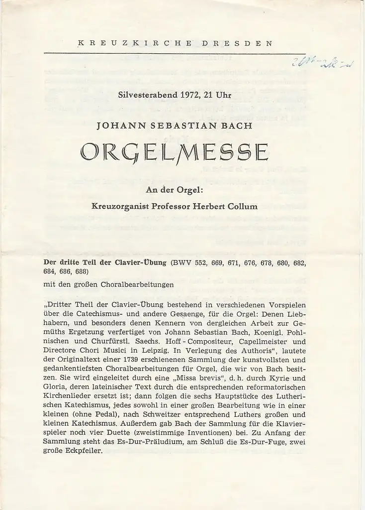 An der Orgel: Kreuzorganist Herbert Collum. Der dritte Teil der Clavier-Übung ( BWV 552, 669, 671, 676, 678, 982, 684, 686, 688 ) mit den großen Choralbearbeitungen. - Theaterprogramm, Opernprogramm, Ballettprogramm, Musicalprogramm, Konzertprogramm, Theatermemorabilia, Programmhefte Sammlung, deutsche Theatergeschichte.