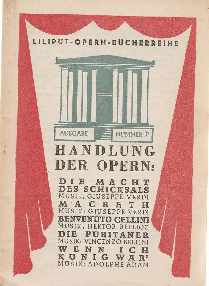 Handlung der Opern: Die Macht des Schicksals Musik: Giuseppe Verdi / Macbeth Musik: Giuseppe Verdi / Benvenuto Cellini Musik: Hektor Berlioz / Die Puritaner Musik: Vincenzo Bellini / Wenn ich König wär Musik: Adolphe Adam - Theaterprogramm, Opernprogramm, Ballettprogramm, Musicalprogramm, Konzertprogramm, Theatermemorabilia, Programmhefte Sammlung, deutsche Theatergeschichte.