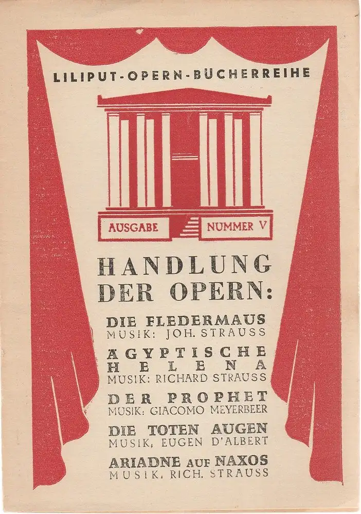 Handlung der Opern: Die Fledermaus Musik: Joh. Strauss / Ägyptische Helena Musik: Richard Strauss / Der Prophet Musik: Giacomo Meyerbeer / Die toten Augen Musik: Eugen D'Albert / Ariadne auf Naxos Musik: Richard Strauss - Theaterprogramm, Opernprogramm, Ballettprogramm, Musicalprogramm, Konzertprogramm, Theatermemorabilia, Programmhefte Sammlung, deutsche Theatergeschichte.