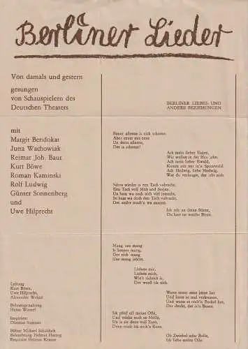 Deutsches Theater Berlin / Staatstheater der DDR, Dieter Mann, Alexander Weigel, Heint Rohloff: Theaterzettel  BERLINER LIEDER von damals und gestern  104. Spielzeit 1986 / 87.