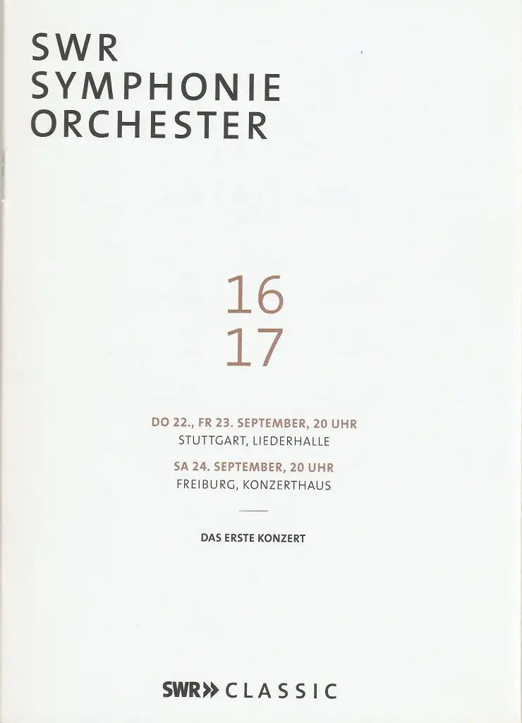 Titel:Programmheft SWR SYMPHONIE ORCHESTER DAS ERSTE KONZERT 23. September 2016 Stuttgart Liederhalle und 24. September 2016 Freiburg Konzerthaus SWR CLASSIC Spielzeit 2016 / 2017