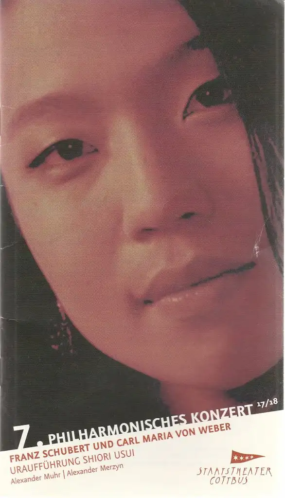 Solist: Alexander Muhr, Klarinette. Philharmonisches Orchester. Dirigent: Alexander Merzin.Porträt Franz Schubert. Programm: FRANZ SCHUBERT: Ouvertüre zum Ritterspiel Die Zauberharfe D 644. Sinfonie Nr. 5 B-Dur D 485. CARL MARIA VON WEBER: Klarinettenkonzert Nr. 2 Es-Dur op. 74. SHIORI USUI: Uraufführung Pya-ryu. Auftragswerk des Staatstheaters. - Theaterprogramm, Opernprogramm, Ballettprogramm, Musicalprogramm, Konzertprogramm, Theatermemorabilia, Programmhefte Sammlung, deutsche Theatergeschichte.