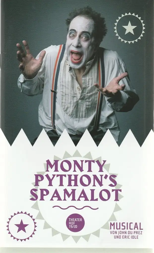 Musical. Aus dem Monty Python Film: Die Ritter der Kokosnuss. Zum ersten Mal am Theater Hof. Musikalische Leitung: Daniel Spaw. Inszenierung: Uwe Kröger. Associate Director & Fight Director: Timo Radünz. Choreographie: Barbara Buser. Bühne: Herbert Buckmiller. Kostüme: Annette Mahlendorf. Mitwirkende: Christian Venzke, Markus Pol, Chris Murray, Tamas Mester, Dustin Smailes, Stephan Brauer / Andreas Bühring, Cornelia Löhr, u. a. - Theaterprogramm, Opernprogramm, Ballettprogramm, Musicalprogramm, Konzertprogramm, Theatermemorabilia, Programmhefte Sammlung, deutsche Theatergeschichte.