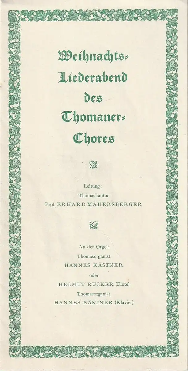Leitung: Erhard Mauersberger. An der Orgel: Hannes Kästner oder Helmut Rucker, Flöte / Hannes Kästner, Klavier. Programm: Weihnachtslieder von Giovanni Gabrieli, Michael Praetorius, Johann Eccard, Dietrich Buxtehude, Johann Sebastian Bach, u. a. Des weiteren Weihnachtslieder aus Holland, Frankreich, Österreich und Ungarn - Theaterprogramm, Opernprogramm, Ballettprogramm, Musicalprogramm, Konzertprogramm, Theatermemorabilia, Programmhefte Sammlung, deutsche Theatergeschichte.