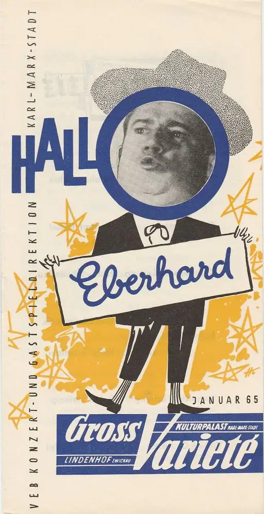 VEB Konzert- und Gastspieldirektion Karl-Marx-Stadt, Walter Gehre: Programmheft HALLO EBERHARD Cohrs Januar 1965 Grossvariete Lindenhof Zwickau / Kulturpalast Karl-Marx-Stadt.