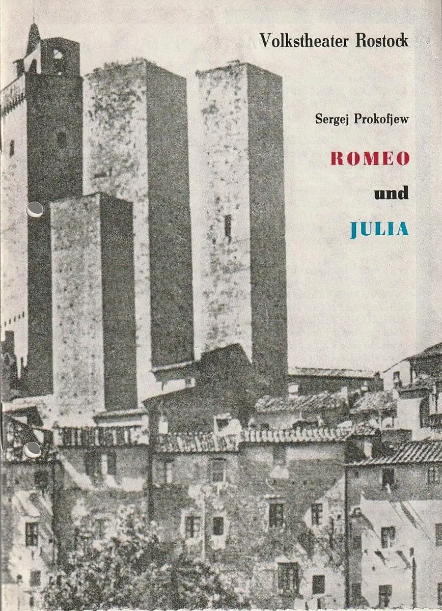 Ballett in drei Aufzügen mit Prolog und Epilog. Libretto nach William Shakespeare. Bühnenfassung des Volkstheaters Rostock von Joachim Ahne und Peter Wittig. Choreographie und Inszenierung: Joachim Ahne. Musikalische Leitung: Christfried Göckeritz. Ausstattung: Heinz Weimer. Mitwirkende: Friedemann Badorek, Norbert Kulla, Romy Langer, Ursula Rößler-Erdmann, Ute Ziems / Jeanette Birk, Rentae Fiefel, u. a. - Theaterprogramm, Opernprogramm, Ballettprogramm, Musicalprogramm, Konzertprogramm, Theatermemorabilia, Programmhefte Sammlung, deutsche Theatergeschichte.