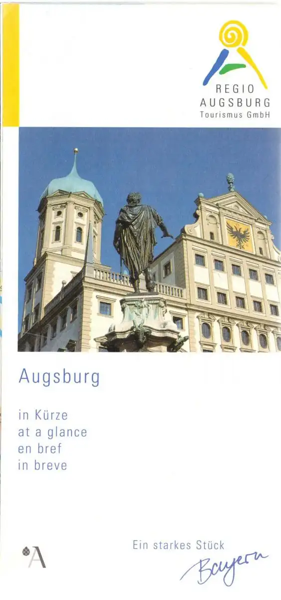 Prospekt, touristisches Faltblatt Augsburg - in Kürze mit Innenstadtplan Erscheinungsjahr: ohne Jahresangabe, um 2005 Herausgeber: Tourist Information Augsburg Format:10 x 21 cm, gefaltet Versandgewicht: 45 g Der