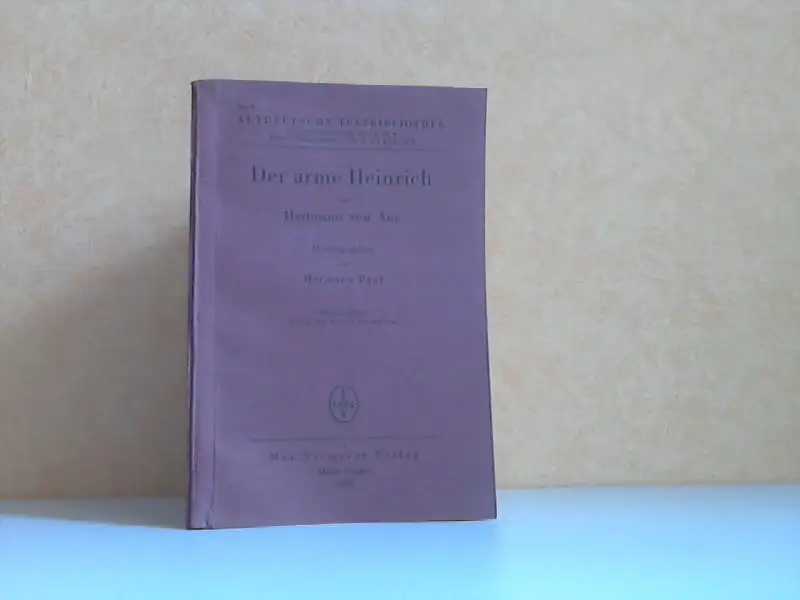 das Buch ist ein Dachbodenfund, gebräunt, fleckig, Einbandkanten mit Bestoßungen, Der revision von Hermann Pauls Gregorius lasse ich in dem vorliegenden hefte die des Armen Heinrich aut dem Fusse folgen. Sie ist nach denselben Prinzipien wie jene durchgeführt worden. In die einleitung habe ich die neuere literatur eingearbeitet und meine Zusätze durchweg in eckige klammern eingeschlossen, so dass sie sich deutlich von Pauls altem text abheben. Der verzweifelte zustand der überlieferung des gedichts ist bekannt. Ich habe den text gewissenhaft durchgesehen und in Orthographie und lautform nach unsern heutigen anschauungen über Hartn?anns spräche normalisiert. Gierach hat mit nüchterner und vorsichtiger methode die überlieierung geprüft und zu reinigen vei sucht und man muss in den meisten fällen, wo er von der vorher angenommenen textform abweicht, mit ihm gehen. Pauls stanpunkt war da vielfach zu konservativ. ... (aus dem Heftchen) Beschreibung vom Antiquariat Ardelt 4h2b Antiquariat Ardelt