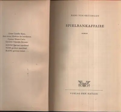 Spielbankaffaire; von Oettingen, Hans; Roman; Spielkasino; Geld; Machenschaften; Manipulationen; Erpressung; Geldgier; Polizei; Festnahme